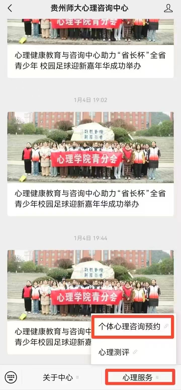 咨询实行预约制,全校师生均可通过“贵州师大心理咨询中心”微信公众号进行预约。