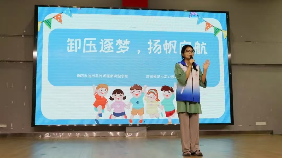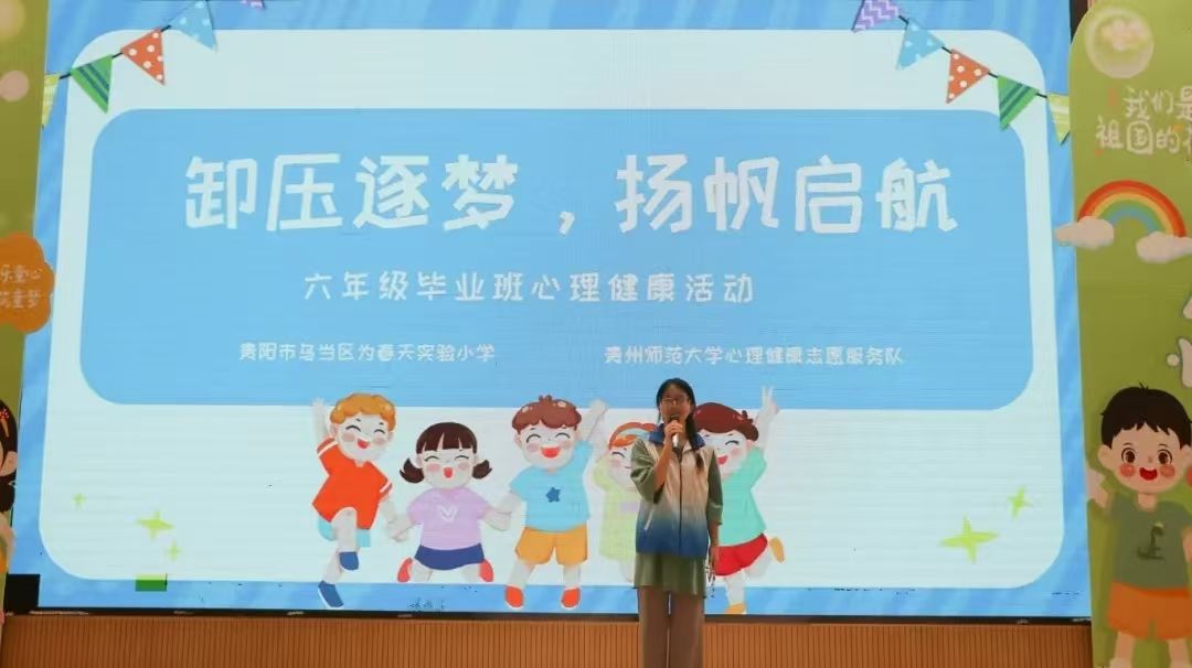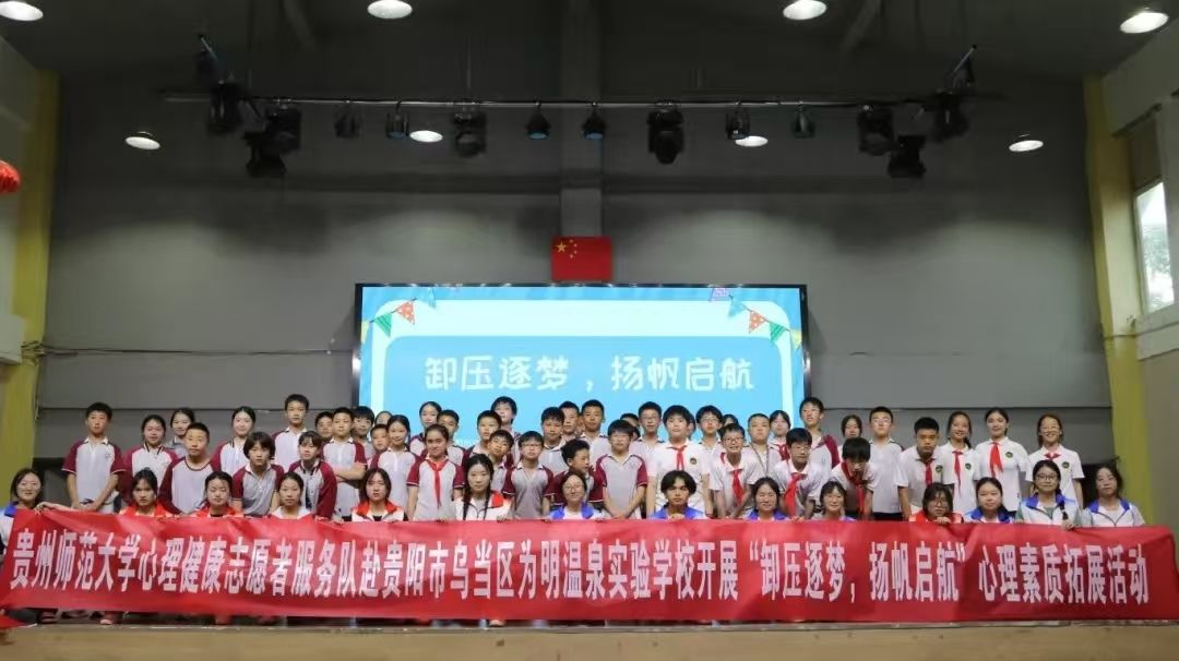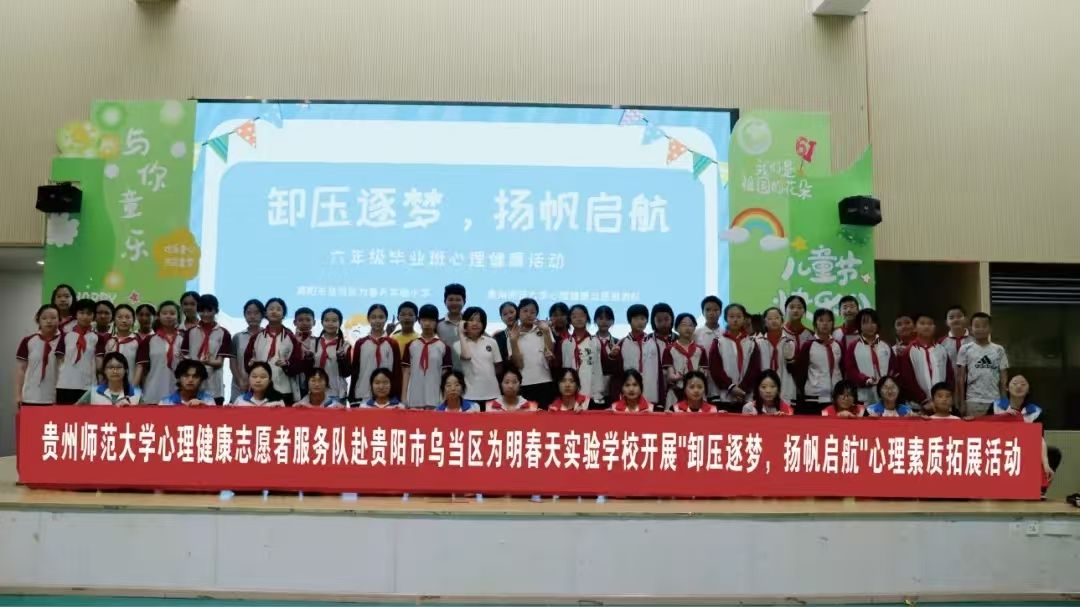 为助力六年级学子以积极心态面对成长挑战,2025年6月20日,心理健康教育与咨询中心受邀赴贵阳市乌当区给为明温泉实验学校、为明春天实验小学两校的六年级学生开展了一场别出心裁的“卸压逐梦,扬帆起航”心理素质拓展活动。此次活动由咨询中心助理宗鹭带领,15名志愿者协同完成。