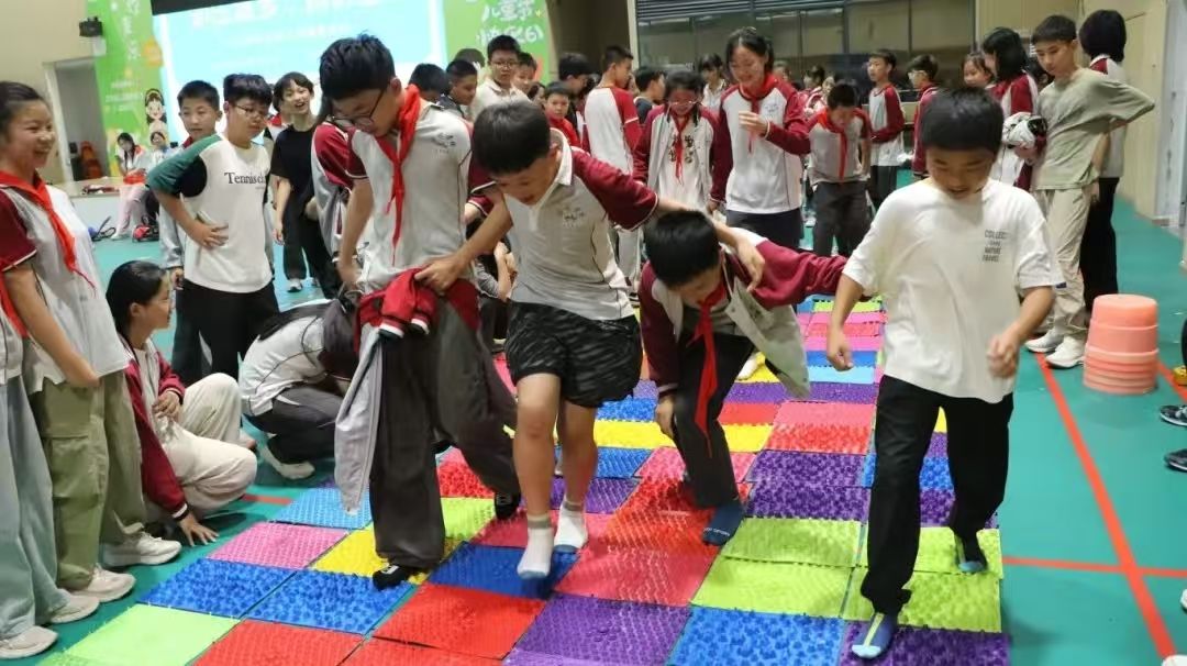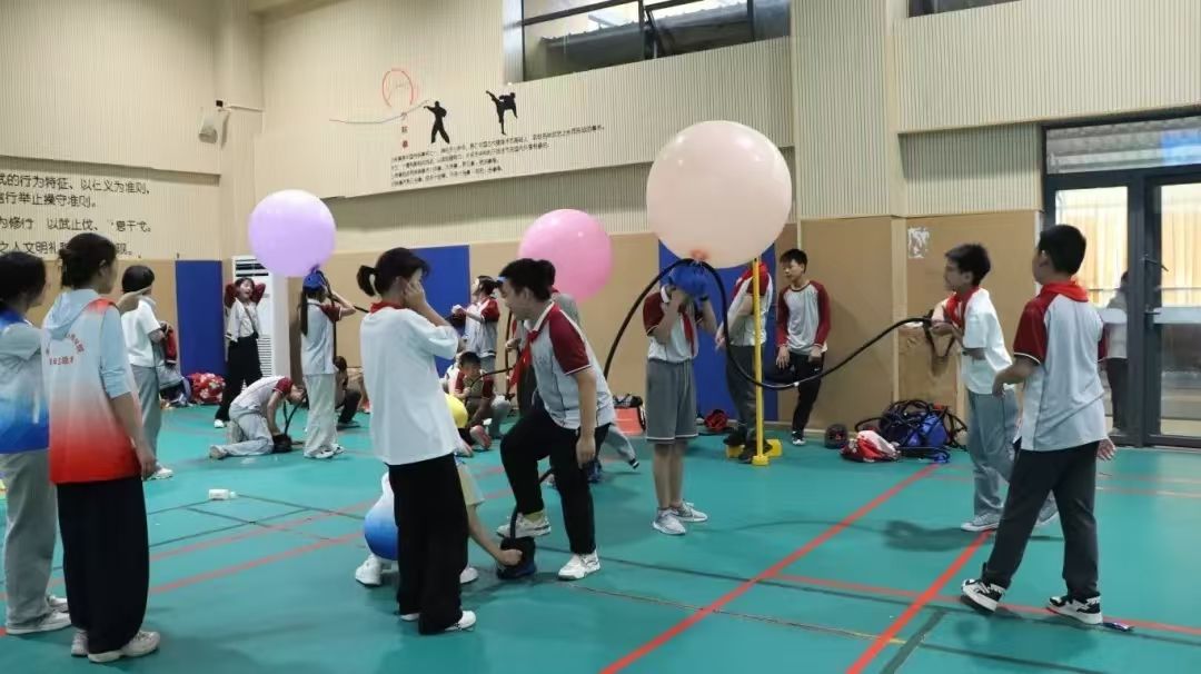 热身活动结束后,主教和助教带领各班开展主题项目。在“头顶开花”活动中,学生们将承载压力与烦恼的纸条封存进气球,通过脚踩气泵将其“引爆”,压力也随着一声声爆鸣声得到释放。“猛龙过江”活动将气氛推向高潮,同学们赤足闯过象征着压力与挑战的指压板跑道,在痛感与欢笑中,将压力转化为奋进的动力。