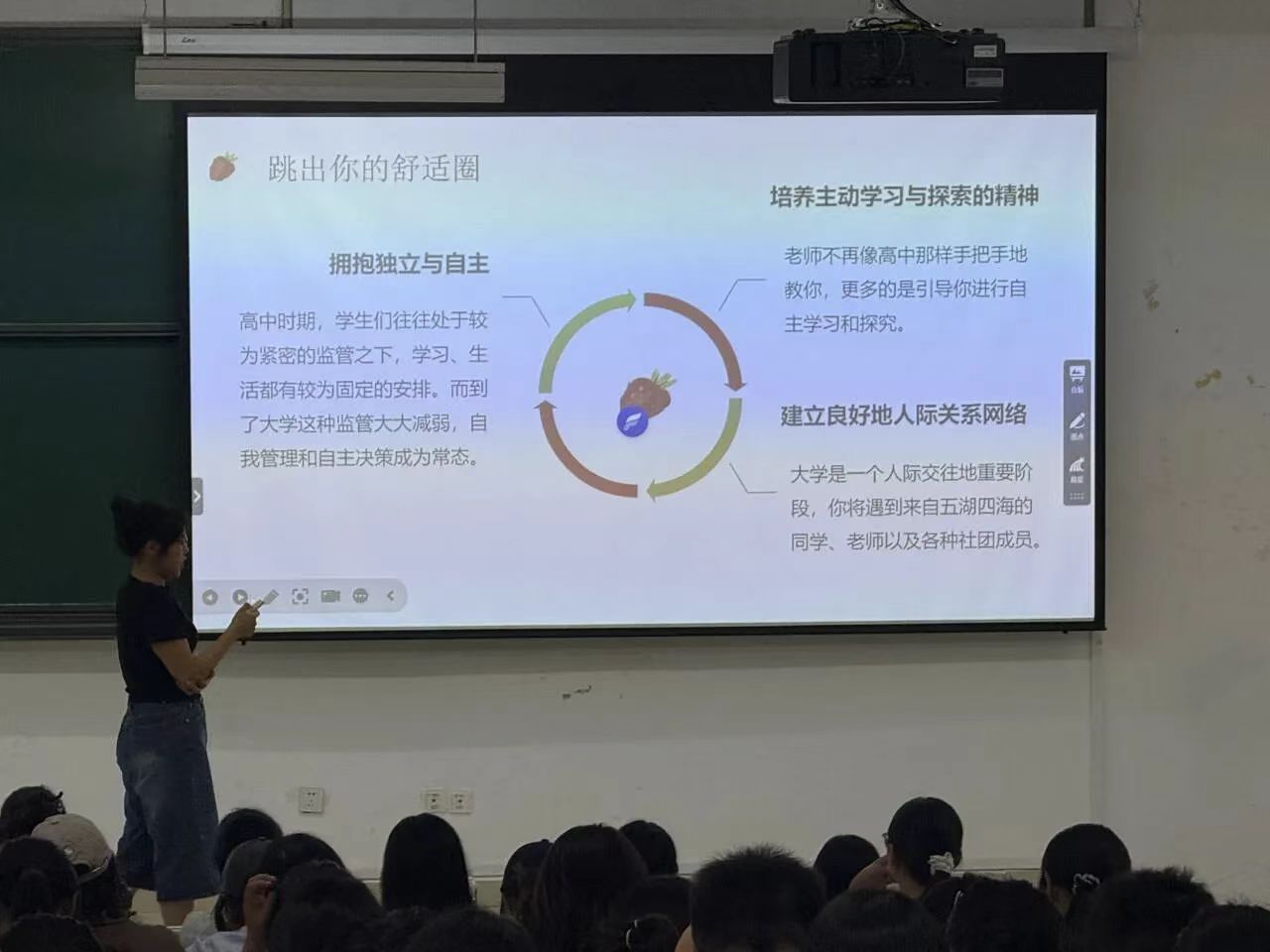 本次活动以“关照新生心理健康问题”为主题,围绕新生适应、压力管理与情绪调节等内容展开。老师通过展示理想和现实大学生活的生动案例,系统讲解了如何识别早期心理困扰,并分享了实用的自我调适方法。现场设置了案例讨论、情景模拟、小组分享等互动环节,让同学们在轻松的氛围中学习并练习情绪疏导技巧。