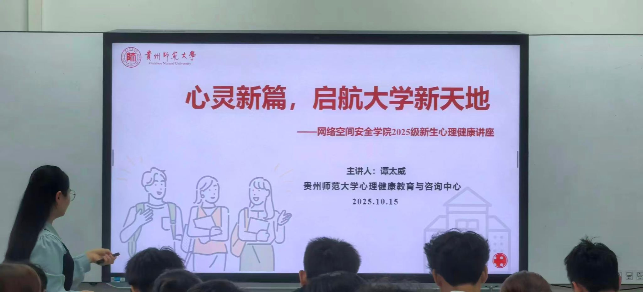 为帮助新生更好地适应大学生活,提升情绪管理与自我调节能力,10月15日下午,网络空间安全学院在公教楼2215教室成功举办了主题为“心灵新篇,启航大学新天地”的心理健康讲座。本次讲座特邀贵州师范大学心理健康教育与咨询中心谭太威老师担任主讲,网络空间安全学院2025级全体新生参加了本次活动。