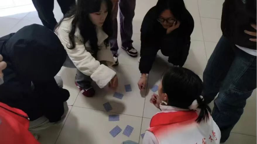 “排兵布阵”环节极具挑战性,各小组需完成翻转扑克牌的任务。接到指令后,各组学子迅速展开激烈讨论、分工协作。大家不仅高效完成任务,更深刻感受到统筹规划与分工协作的重要性,团队凝聚力悄然提升。